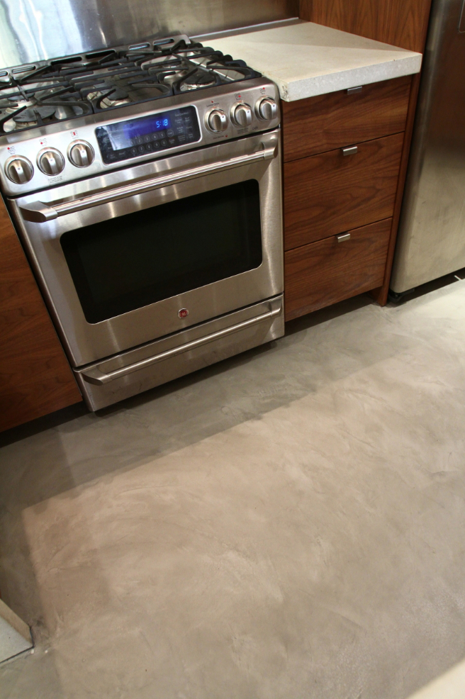 Interior concrete is becoming increasingly popular in residential homes. This textured flooring system added the perfect aesthetic for this urban loft. The lightly textured concrete runs though out the entire loft and looks great in both the living area and kitchen. This project was executed by project manager Robert Ryan and his expert crew.